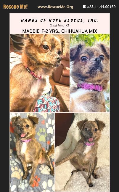 Meet the adorable Maddie! She is a beautiful Chihuahua mix that is as cute as they get! She could cuddle all day long but also loves to play with dogs of all sizes! She even like kitties! Maddie is house and crate trained, but needs someone out with her to make her know she will not be left and is safe. Maddie requires a fenced yard as she could run if she got really scared. Maddie is spayed, current on vaccinations, microchipped and kept on monthly preventatives.�%A0 To apply to adopt Maddie visit our website at www.handsofhoperescue.com. NO PHONE CALLS PLEASE