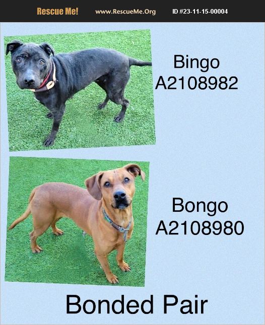 Bongo & Bingo, female bonded pair. Bongo, A2108980: Located At: Los Angeles Animal Services - East Valley Shelter Description: My name is Bongo and I am a spayed female, brown Rhodesian Ridgeback. Age: The shelter staff think I am about 8 years old. Weight: I weigh approximately 62 pounds. More Info: I have been at the shelter since Oct 05, 2023. Available as of Oct 09, 2023. Bingo, A2108982: My name is Bingo and I am a female, black Lab. Age: The shelter staff think I am about 10 years old. Weight: I weigh approximately 53 pounds. More Info: I have been at the shelter since Oct 05, 2023. Available as of Oct 09, 2023. Location: East Valley, 14409 Vanowen St. Van Nuys, CA 91405. 818-756-9323