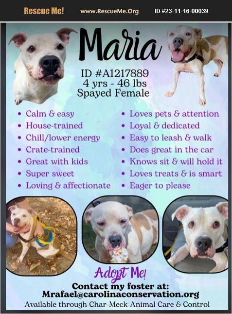'M' is for Marvelous Maria. Maria is calm, sweet, dedicated, loving, chilled out, loyal and smart. All the adjectives that you would want in a dog! Her low energy and easy going personality makes her the sweetest doggie companion. This girl clearly had a rough life but she is so eager to please that it makes you have faith in the resilience of her spirit. She is an itty bitty pitty and so full of affection, love and kindness. She always greets you with a little spin and has the cutest most 'boopable' nose. She already knows the commands of: sit, wait, paw and crate. She is happy to sleep silently in her crate without making a peep or be left out because she is non-destructive and won't bother your things as long as she can lounge on her doggie bed. Her affectionate and patient nature makes her great with children of all sizes that she has met. She truly is the most wonderful dog and is deserving of an equally wonderful home. She will repay you back with loyalty, companionship and being an overall kind-hearted well-mannered pup!