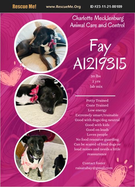 Fay narrowly escaped euthanasia at Animal Care and Control. Volunteers recommend her to me and she really has been such an easy foster. She is crate and house trained. Low energy, couch potato kind of dog. She is good on leash and dog neutral. Not really a playful pup, she prefers to just lounge around but she will never turn down a game of fetch. She loves all humans. Loud noises and some dogs still scare and she needs a little reassurance. She is so deserving of a loving hime.