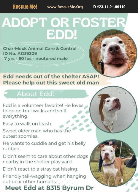 Edd is a total love bug! How this boy is in the shelter is beyond me. He loves snuggly and is the best 'grandfather' to his foster siblings. He would make such an amazing family member. He has never ever shown aggression towards people, dogs, cats or even rabbits in the household! He snuggled right up to his fosters 8 week old puppy.