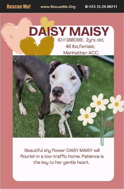 Available NY,NJ,CT,PA,DC,MD,DE,NH,RI,LI,MA,VT,ME Beautiful shy flower DAISY MAISY will flourish in a low-traffic home without other dogs. Patience is the key to her gentle heart. We don't have currently complete info on DAISY MAISY. If you wish to adopt please apply via the nycacc.app link: https://nycacc.app/#/browse/188099 or you can foster/adopt via a rescue by applying here: https://forms.gle/ozHex3uqvNkQt2dq9 my movie: https://youtu.be/qBu4TsLuMd8 What my friends at ACC say about me: My history is a mystery and my friends here do not know much about me yet! I am looking for a home with a patient person. I will flourish in a calm environment and a low-traffic home. DAISY MAISY, ID#188099, 2yrs old, 46 lbs,female, Manhattan ACC medium Mixed Breed,, color black/white Surrender Reason: stray Shelter Assessment Rating: Level 2 Single-pet home, Recommend no dog parks at risk memo Daisy Maisy is on emergency placement for behavioral reasons. She has demonstrated a high level of on-leash reactivity which has further redirected into frustration when being leashed in-kennel, often biting and tugging at the leash. Daisy Maisy has started to focus on her kennel walls causing herself harm due to stress as well. Medically she is underweight and recently recovered from CIRDC. SURRENDER NOTES came into the shelter as a agency on 11/25/2023. Date of intake:: 11/25/2023 Spay/Neuter status:: No Means of surrender (length of time in previous home):: Stray, no known history SHELTER ASSESSMENT Date of assessment:: 11/30/2023 Summary:: Leash Walking Strength and pulling: Mild Reactivity to humans: None Reactivity to dogs: Mild Leash walking comments: Sociability Loose in room (15-20 seconds): Moderately social Call over: Approaches readily Sociability comments: Explores the room Soft handling: Seeks contact Exuberant handling: Seeks contact Comments: Leans into contact Arousal Jog comments: Follows handler with loose body Knock Knock comments: Approaches with coaxing Toy Toy comments: No interest Summary:: 11/30/23: Gate Greeting- Rushed forward, hard barked with tense body Summary (2):: 12/26/23- Daisy was at the front of her kennel with a slight tense body and barking, when handler went to leash she started to bite the leash. Handler tossed treats and while she was eating handler was able to leash. When exiting her kennel, she hard pulled towards neighboring dog. Handler was able to have her exit the room, once out she pulled towards the door to the same kennel room. Handler tossed treats away from the door and she followed. Once on the street, she walked ahead of handler with a soft body, when called she would stop and sit to accept a treat. She allowed handler to pet her chin and head. Upon returning to her kennel, she again pulled towards the neighboring dog and handler tossed treats into kennel. She followed in and handler was able to remove leash without any further issues. 12/22/23: Daisy is spinning in circles, pacing around, and jumping high in her kennel when hearing the neighboring dog barking. She does not stop this behavior when handlers approach. Eventually once circling to the front, she takes high value treats like ham. She will grab and tug the leash periodically when no treats are given. Handler is able to leash her while a second handler feeds her. She is removed from kennel where she attempts to cage fight, lunging, growling, and barking. She is then taken outside for a street walk where she walks nicely alongside handlers. She will lean against them for petting and nudge their hands. She also catches treats when tossed. Daisy is returned to kennel where she attempts to cage fight again. She is placed in kennel without further issue. Summary (3):: 12/21/23- Daisy is pacing and jumping in her kennel when handlers approach, she is jumping up to the side of her kennel where her neighboring dog is barking. One handler tosses treats and other handler was able to leash her. When exiting her kennel, she tried to cage fight with the dogs in passing. When exiting the room, she would try to pull back into it. Handler pulled her away and tossed treats to distract her. When passing the other door for the kennel, she again was trying to pull into the room and barking. Handlers pulled her away while tossing treats to redirect. Once in the elevator, she became softer. While on the walk, she accepted treats and she went to the bathroom. Handler soft spoke to her and she would follow handler, allowing them to pet her. Upon returning her, she would cage fight and when returning to inside her kennel she was hard barking and pulling towards the neighboring kennel. Handler tossed treats and used some force to get her back in her kennel. She was unleashed without further issue. 12/21/23 ACS staff reported that they were unable to remove Daisy from kennel due to leash biting, grabbing and tugging into kennel. 12/21/23: Daisy continues to grab the leash in kennel and pull it in. She also cage fights with