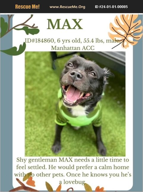 Available NY,NJ,CT,PA,DC,MD,DE,NH,RI,LI,MA,VT,ME Shy gentleman MAX needs a little time to feel settled. He would prefer a calm home with no other pets. Once he knows you he's a lovebug. We don't have currently complete info on MAX. If you wish to adopt please apply via the nycacc.app link: https://nycacc.app/#/browse/184860 or you can foster/adopt via a rescue by applying here: https://forms.gle/ozHex3uqvNkQt2dq9 MAX, ID#184860, 6 yrs old, 55.4 lbs, male, Manhattan ACC large Mixed Breed,, color black Surrender Reason: Shelter Assessment Rating: directly adoptable SURRENDER NOTES SHELTER ASSESSMENT MEDICAL EXAM NOTES TO FOSTER / ADOPT ** If you would like to adopt a NYC ACC dog, and can get to the shelter in person to complete the adoption process, you can contact the shelter directly. We have provided the Brooklyn, Staten Island and Manhattan information below. https://www.nycacc.org/adoptionprocess or if you live in NYC, you can apply to foster a dog with the ACC https://www.nycacc.org/get-involved/foster Shelter contact information: Phone number (212) 788-4000 Email [email protected] Shelter Addresses: Brooklyn Shelter: 2336 Linden Boulevard Brooklyn, NY 11208 Open for adoptions: Monday - Friday: 12pm - 6pm Saturday - Sunday: 11am - 5pm Manhattan Shelter: 326 East 110 St. New York, NY 10029 Open for adoptions: Monday - Friday: 12pm - 6pm Saturday - Sunday: 11am - 5pm Staten Island Shelter: 3139 Veterans Road West Staten Island, NY 10309 Open for adoptions: Wednesday - Sunday: 12pm - 5pm If you CANNOT get to the shelter in person and you want to FOSTER or ADOPT a NYC ACC Dog, an approved rescue will be able to get the dog for you, you need to apply via this form https://forms.gle/ozHex3uqvNkQt2dq9 : You MUST live in NY, NJ, PA, CT, RI, DE, MD, MA, NH, VT, ME or Northern VA as this is the prescribed range of states where NYCACC dogs can go.