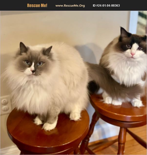 My father in law has two male Ragdoll cats purchased from two breeders in Lancaster, PA approximately 8/9 and 10 years ago. My mother in law unexpectedly passed away- these were her companions and my FIL is unable to care for them. I do not have any vet records available- I checked with her vet and they have not been in since purchased (healthy cats!). Both are friendly and enjoy to be pet and attended to. Billy (cat on left) is more likely to sit on your lap. Teddy is more independent. Both friendly and easy-going. They currently live with a cocker spaniel and do just fine together. They are also frequently around an Australian Shepherd dog. Cats are available ASAP from Berks County. YouTube: 'Ragdoll Kitties- Teddy and Billy'. https://youtube.com/shorts/paMjdtBvWHg?si=-y8uvZcCy66hVeqs