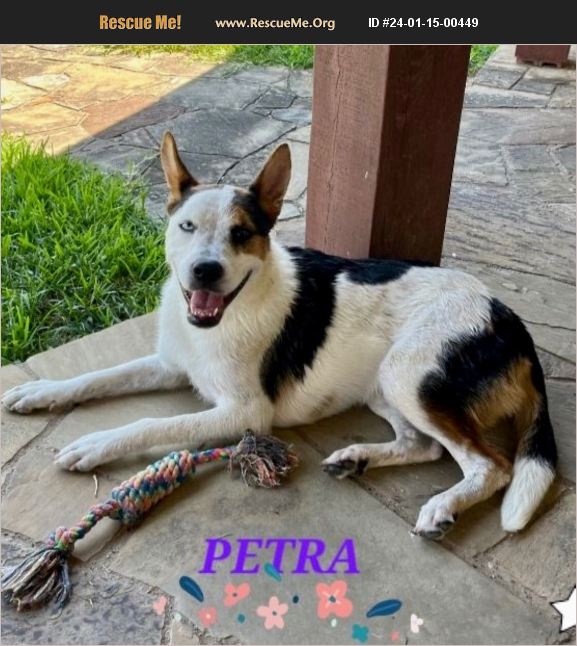 Petra is currently in Colorado in a foster home. She is in need of a home soon. PETRA is a very loving, happy and pretty 2 year old Heeler mix looking for an active family to share life. Young, playful, energetic girl who would be a great running/hiking/adventure companion. A sweetheart who is loyal and devoted to her people - just a wonderful girl. She has the cutest personality with loads of love to give. Loves all people, likes to cuddle and knows how to relax after she has some exercise. Kid friendly and plays well with them. We are recommending 5 years and older. Dog and cat friendly. Can be an only dog if she gets daily exercise and attention from her humans. She likes to play a lot, so a dog her size or larger would be best if you have another dog. Housetrained with great house manners. Crate trained. Has good house manners with no destructive behaviors shown inside or outside. Intelligent, quick learning girl who knows basic commands 'sit, down, lay, come, down' and has even learned to open doors. She comes when you call her name, if she's not already following you around. Treat motivated and takes treats gently. Walks well on leash and off leash. Stays close to her people.. Loves playing, fetch, all toys, especially squeaky toys. Not a big barker, but will alert you to someone at the door. Only homes with a fenced yard will be considered. Petra is 60 lbs, spayed, microchipped, up to date on all vaccines, including rabies, heartworm negative and current on prevention.