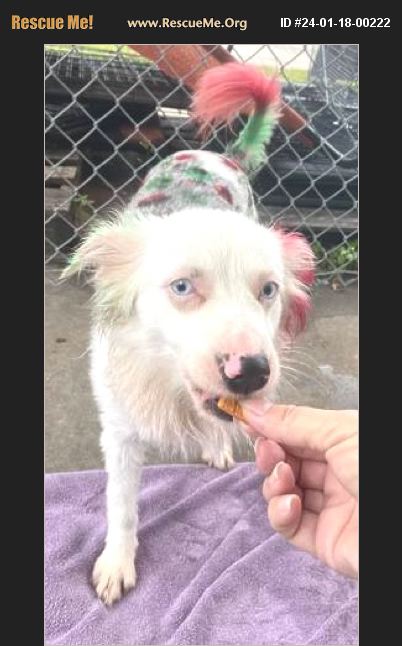 This girl is amazingly sweet! She was perfect for her bath which sadly did not remove the colors she arrived with. She is very easy to handle and enjoyed snuggling with her new friend while getting dried off. She is hearing impaired but was watching the groomer's treats, which she takes very gently when offered. She will be available for adoption on 1/23 if not returned home prior. She is in the 6 month - 2-year age range and weighs 27lbs. To get on her wait list, please call 352-746-8400 or email [email protected]. ID#55121862