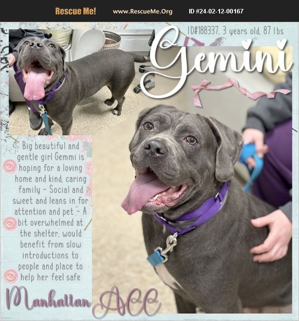 Available NY,NJ,CT,PA,DC,MD,DE,NH,RI,LI,MA,VT,ME Gemini will win you over if you give her the opportunity. Nearly 90 lbs. of sincere sweetness in a soft, gray fur coat. Her eyes are honest, loving and hopeful. She has a softness and smoothness to her that stands out in the crowd. Like so many upon entrance, she was terrified, just a few short days later making friends everywhere she goes. Her video captures her and her easy vibe perfectly. She will seek attention and affection and genuinely puts effort into connecting. Seeing her drape her sprawling tongue to the side of her smile just melts the heart. This sweetheart is most worthy of a loving home. She might be a bit of scaredy cat initially, she did run away from the assessing dog, which makes her all the more endearing. Gemini doesn't have a mean bone in her body. If you're searching for a special girl with only love in her heart, you'll adore her. Message us now if you'd like to save her! GEMINI@MANHATTAN ACC Gemini ID#188337, 3 years old, 87 lbs Large Mixed Breed, Gray Unaltered Female Came into shelter as a STRAY �'��Medical Behavior Evaluation: Behavior Evaluation Rating: LEVEL 3 INTAKE DATE 11/ 2023 PET PROFILE: My health has been checked. My vaccinations are up to date. My worming is up to date. I have been microchipped