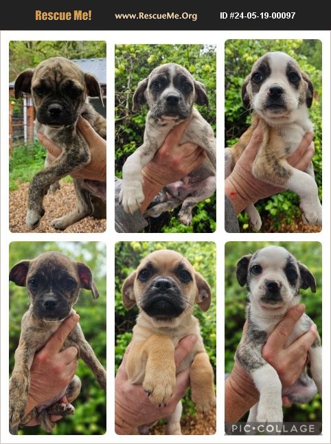 This litter is approximately 12 weeks old on the 18th of May. They were turned into the shelter by their owners. They are said to be Beagle/Boxer puppies. However, they are pretty small at only 6 (female) and 7 (male) lbs. and their tails are curly. They're not going to be large dogs; they are too small and we assume they'll get no larger than around 30-40 lbs. at maturity. They have been around large dogs and have done well. They all have different personalities and temperaments. Their coloring is extremely unique and they're simply beautiful. These are confident and active puppies with independent streaks. The males are a little calmer than the females and they're also bigger. They're all doing pretty well with potty training in their crates. They have had no accidents and can hold it through the night. All puppies this age still need work when in the house. They're currently in 3 different foster homes but we will bring all of them together for our meet and greets. We recommend potential adopters meeting all the puppies and we'll tell you about their personalities. They're all being crate trained (in 2's) and are doing well. They would make good apartment dogs as they're pretty quiet. The initial separation of siblings will cause them to cry, which is normal for all puppies, but this should stop within a few days. The 3 females, Ducky, Bonnie, and Jasmine are balls of energy. They love to run and explore. They love to play, and chew on their toys. The 3 boys, Spike, Clyde, and Tigger are also active but can settle more quickly. They also love to play and follow their sisters around. All of them like to snuggle after they've had their play time and got their energy out. At this age they can be introduced to dogs and cats and should not have any issues. All puppies are spayed/neutered. up-to-date on vaccines, dewormed, and microchipped. You can see more of them on our IG page the_wallflowers_shine_project under 'stories' 'highlights'. If interested in a meet, you must fill out an adoption application on our website www.wallflowersshine.com/application. Thank you!