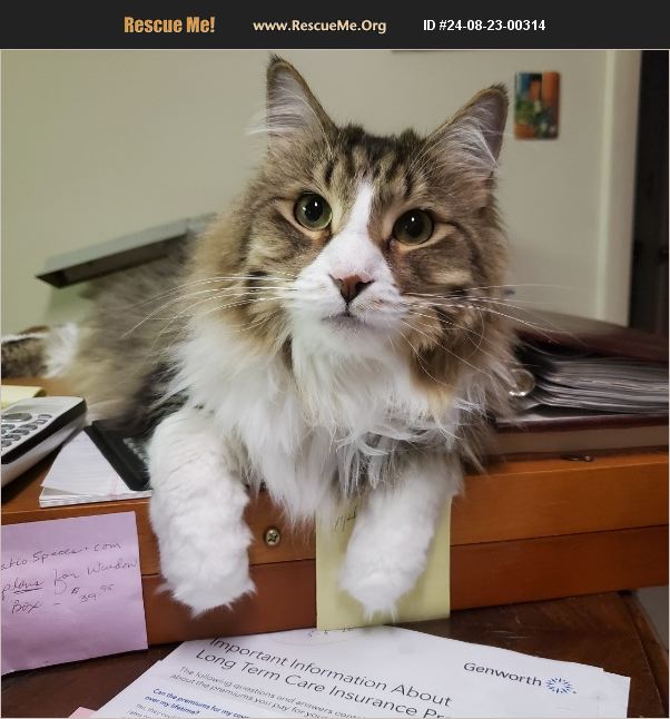 Part Maine Coon. Very verbal. Very loveable. Sheds. No front claws so needs indoor home only. Owner passed away recently and his temporary home has 3 other cats. Gus is a temporary guest. He has a carry case. Curious. Likes tops of cabinets, tables, laps, feet, beds, sinks, etc. Not temperamental.