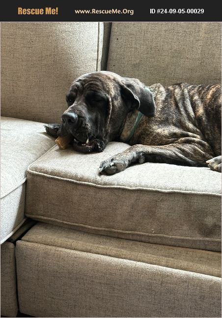 I have relocated with my job and can not take my 3 year old Mastiff. Her birthday is June 2nd and she loves to cuddle and play in short bursts. She is an inside dog and does not tolerate being outside alone very well. She will keep you warm at night if you let her!! She is Brindle English Mastiff.