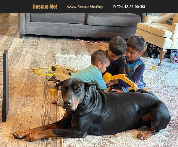 2 year old male Doberman. Lives with 2 other dogs and aroun 3 kids. We are moving out of state and cannot accommodate at new location.