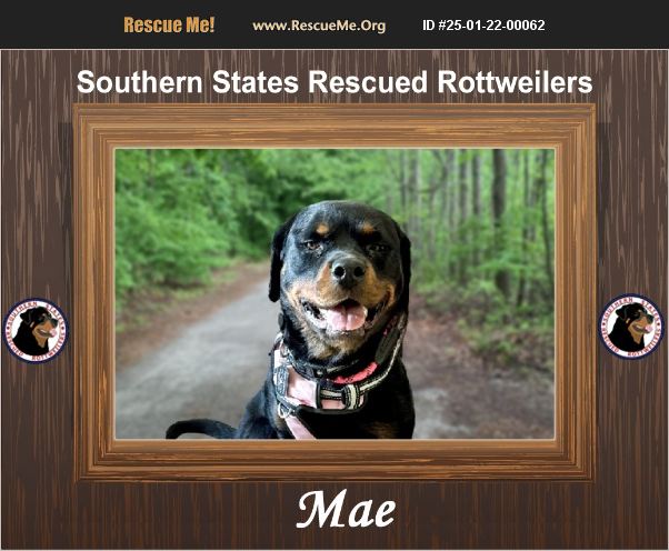 Mae is a cutie patootie in need of a home. An adorable 'Pocket Rott', two years old and full grown at just 65lbs, Mae is small for a Rottweiler. Her small size is an advantage because she insists she is a lap dog. Mae has had a rough life of neglect and starvation, but she is a trooper. She has recovered from every kind of intestinal parasite that a dog can get infected with in the US. Her teeth are better described as ground off nubs. She is food motivated and tries to steal what she can reach. She likes being close by to people, almost to the point that she has a fear of abandonment, but she does very well in a crate (long crate times were necessary during her treatments and recoveries). Mae is responding well to training, but still thinks her puppy eyes will get her excused for theft attempts. She does well on a leash except when there are leaves blowing in the wind for her to chase. She may be full grown, but she still has puppy manners. Like all Rottweilers she will need continuous training, attention, and exercise. Despite early health issues and her small stature, Mae is a strong puller. She has grip strength enough to play tug, loves to chase balls and frisbees, and likes big toys. Despite her teeth, where it comes to toys, she is a super chewer. Mae is cat and dog friendly (her foster home has both), after an appropriate adjustment. She is ready to show off full puppy energy and shower a family with love. Upon approval to adopt, you will be sent SSRR Decompression and Introduction requirements that we require ALL of our adopters to follow . You will be asked to acknowledge receipt of these requirements, verify that you have read them and that you will follow them.