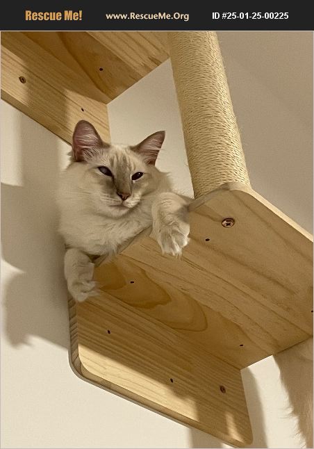 Beautiful 1 year old lilac point Balinese, blind in one eye from a scratch she got as a kitten, but no limitations on her movement or lifestyle. We travel a lot and my wife has a lot of health issues to attend to, so Rosie deserves owners who are more available than we are able to be.