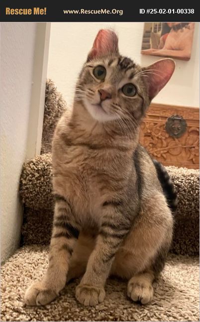 Abby (born July 2024) is an intelligent beauty who thoughtfully reads the room before jumping into play. She loves vertical space, and cat trees or wall mounts are recommended for her climbing nature. She is a soccer star and dribbles and chases ping pong balls with style. Abby (rescued along with her brother Benji) is a shy foster and an independent soul. She is always near but doesn't like over-handling. The way to her heart is with play. She will run to partake, but not if other kitties are too rough. She could do well as a solo kitty. She particularly loves bedtime to socialize - jumping up on your bed to purr, head butt and cuddle - happily settling nearby to snooze alongside you. Abby has a soft ticked tabby coat and big, beautiful gold green eyes. (maybe Abyssinian mix?) At mealtime, Abby is not shy and chirps or squeals for attention. In a loving, peaceful home, her confidence will shine with time, and she will delight with her energy and sweet presence. To learn more, visit socalpetrescue.com