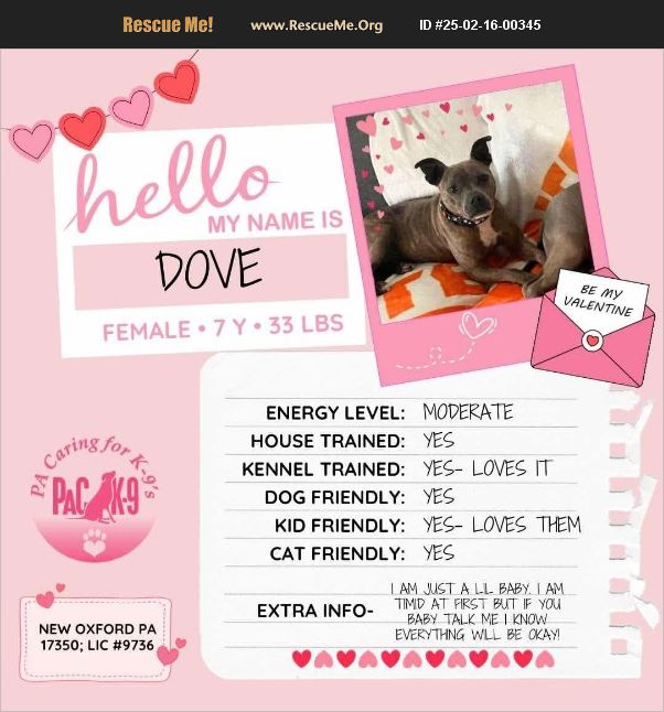 Dove is a beautiful 7 year old brindle mixed breed. She weighs 35 lbs. She is a sweet girl who is crate trained and house trained. Dove is good with other dogs, older kids and cats. She will be timid when she first meets you but once you gain her trust she will snuggle with you. She does good in the car and walks well on a leash. Dove is a heartworm survivor, she is spayed and up to date on vaccines. If you think Dove would be a great addition to your family apply now so your application can be processed for when she is ready to be adopted. She will be hanging out in New Holland PA waiting for you. New Oxford PA 17350; LIC #9736 We are PA Caring for K-9's, an all-breed dog rescue that is solely run by volunteers. Most of our dogs are rescued from high kill shelters in the South. If the dog is posted, they are still available! Once arriving, these dogs enter foster homes, as we do not have a shelter. We cannot adopt out dogs to a home with dogs that are not fixed or up to date on shots. If interested in adopting, please submit an application online at www.pack9rescue.org. Our adoption fee for altered dogs is $350 and goes directly to saving the lives of more dogs. Our adoption fee for unaltered puppies will be $400 which includes a refundable $50 deposit upon receipt of spay/neuter certificate. Learn more about adopting from us or volunteering for us at www.pack9rescue.org or check us out on Facebook for more information and a complete list of dogs available for adoption. https://www.facebook.com/PaCaringForK9s/ See upcoming events below where PA Caring for K9's will be with some of our adoptable dogs! Saturday, March 22, 2025 10am-1pm Ciocca Subaru of York (1202 Loucks Rd, York, PA) Saturday, April 19, 2025 10am-1pm Tractor Supply Co. (495 North Enola Rd, Enola, PA) Please check our Facebook page closer to each event as we will update daily with dogs who will be attending. All are invited to meet our dogs, but only pre-approved adopters with all household humans and dogs present will be able to adopt at the event. Apply today at https://www.pack9rescue.org/applications/ to become pre-approved.
