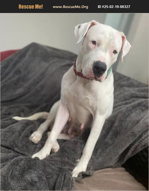 Eva Magnolia is a Dogo Argentino (rescue me does not have a drop-down box for this breed) She is a beautiful girl whose favorite things are relaxing, socializing and getting plentiful cuddles. She is a social butterfly who will greet strangers like long lost friends and if invited will lavish you with cuddles and affection. Eva thinks being petted is the greatest thing in the world. She even likes going to the vet because the staff give her cuddles and ear scratches. Eva is a good walker and prefers a harness to a collar. She is loving, kind and gives her whole heart to you. In her early life she was used for breeding but she bears no grudges and treats every human as though she has experienced nothing but gentle kindness since the day she was born. Eva is a fun dog who would fit well into any family.