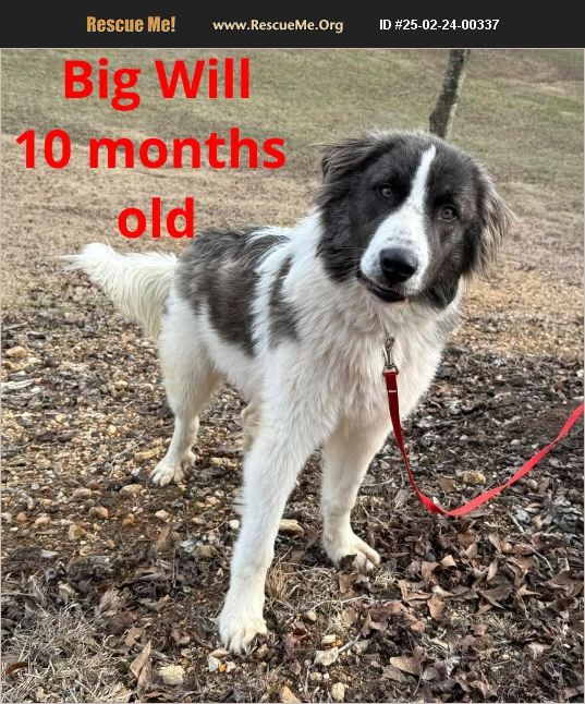 Big Will is a 10 month old that we think might be a Great Pyrenees/ Australian Shepherd Mix. He weighed only 58 lbs when he was abandoned and really should be closer to 100. He is gaining and doing good! He loves everyone, dog, cats, and kids! He is neutered, vaccinated, heartworm negative, dewormed, and microchipped. His adoption fee is $350