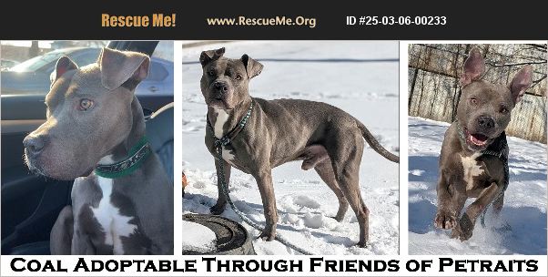 Coal is a happy, sweet, and playful, two-year-old, 50-pound, male blue and white Pit Bull Terrier looking for a loving guardian. Coal came into Chicago Animal Care and Control the day after Christmas 2024. Found stray on the far south side of Chicago, this super nice boy loves people and is tail-waggingly friendly both with dogs as well as cats. He is currently living in a foster home with a dachshund and two cats and doing great! He sleeps on the floor in the bedroom and his foster mom no longer crates him. Coal loves treats and will sit automatically for them. And, then he may jump in your lap. He's great in the home, housebroken, loves squeaky toys, nice on car rides (especially the one that drove him from the shelter to his foster home on February 21st), and even good on leashed walks. Coal is now healthy, neutered, up-to-date on rabies, distemper and Bordetella vaccines, micro-chipped, heartworm-tested and on monthly preventative. His adoption fee of $200 benefits the rescued pets of Friends of Petraits Rescue. If you are interested in meeting and possibly adopting Coal, please fill in an adoption application at https://friendsofpetraits.com/dog-adoption-application/ and follow up by contacting [email protected] to make an appointment to meet him. He is currently being fostered in Elmwood Park, a suburb just west of Chicago, Illinois.