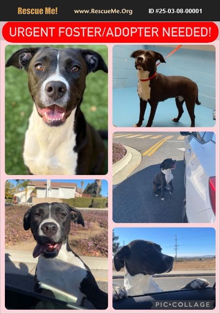 URGENT! Video link included. Sweet Stray Desperately Needs a Home! This beautiful girl now named Kate was found in Moreno Valley as a stray, going from car to car, begging for someone to take her home. Now, she's sitting in the shelter, hoping for a second chance. Located at: Moreno Valley Animal Shelter. ID: A540533. Breed: Black & White Labrador Retriever/Pit Bull Terrier. Age: 1 year, 7 months (just a baby!) Weight: about 60 lbs. At shelter since: Jan 21, 2025. AVAILABLE NOW! She is SUPER friendly and just wants to love and be loved. SHELTER NOTES: Very sweet girl. Easy to leash and walk through the kennels. Showed no issues or aggression walking by the other dogs in the kennels. Sits and takes treats, gently. Loves to play with toys. Loves pets and scratches more. Kate's young, full of life, and waiting for her forever family. Don't wait, her time is running out! Please go to the shelter and adopt her. If you can't adopt, please offer to foster and SHARE so she can be seen by as many people as possible! Let's find her a home before it's too late! VIDEO: https://www.facebook.com/100009310861488/videos/9517031208340023/?mibextid=wwXIfr