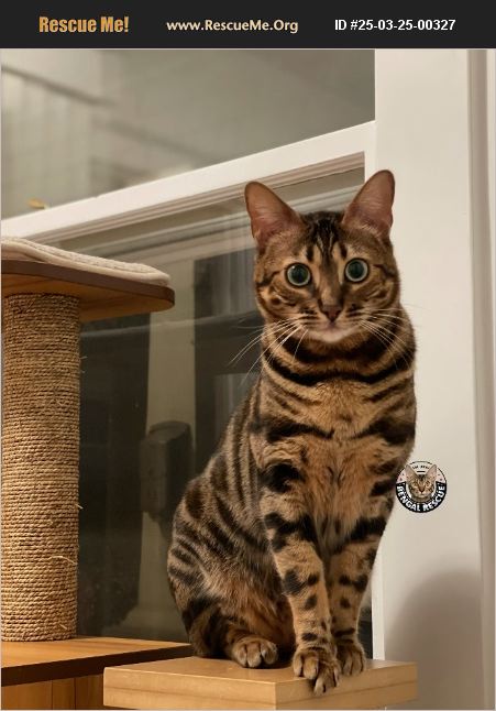 ***Bengal Breed Experience Required*** ***Only-Cat Syndrome*** ***Child 12+ with Bengal Experience may be OK*** Ishi is a sweet, beautiful, and regal 5-year-old queen of a Bengal. She lived in a single family household with a very calm child (pre-teen now), another Bengal (male) a cat-friendly dog. For years, the cats in the home co-existed with little to no drama - but suddenly one day, things changed. Ishi began to bully the resident male Bengal. With the cooperation of Ishi's owner, we moved Ishi to a loving foster home that had no other pets. As much as the foster wants to formally adopt her, he has frequent travel that would impact Ishi's stability�%A0(Bengals are known to suffer from separation anxiety).�%A0 We know that Ishi will thrive in a home where she is the absolute center of attention. Ishi is the true definition of regal, in the way she carries herself and behaves. She is a 'typical Bengal' in the sense that she loves to 'do what she wants to do.' When she is bonded with you, she wants to be in a room with you, but will choose if / when she wants to cuddle. She loves climbing trees and surveying her world from the top of a climbing tree, perch, shelf or hammock. She is very athletic and loves playing with wands, finding hidden treats, playing in giant boxes, splashing around with running water, and just being an inquisitive cat! She has only been an indoor cat, but can be curious about the outdoors before quickly running back inside. She may be open to walks on a secure harness - we're not sure. Like most Bengals, she allows her humans to pick her up and carry her around on occasion - however she prefers to move to places / areas at her own pace vs. being a 'carried accessory.' As far as children go, she has always been great with calm children. She would NOT enjoy being in a household that is too chaotic, loud, being pursued by excessively grabby hands, or being chased. Ishi has received regular routine Veterinary care, and has no underlying health issues. She also went to the dentist in September and had a tooth removed. It is recommended that her future Veterinarian check her annually to ensure her overall health and dental health is monitored. We truly believe that Ishi would do best in a household as the solo animal and with a person or family who can be patient with her during her transition and understands the physicality / needs / experience with Bengals. She is a real alpha and independent queen! She really is an amazing cat who is incredibly loved. We will wait for the right family to come. She deserves no less! Ishi has been fully vetted throughout her life. She is spayed, vaccinated, microchipped and has good litter box skills, overall. She is currently eating freeze dried raw food and would definitely do well on a raw food diet. If you are interested in adopting Ishi, please fill out our adoption application https://bengalrescue.org/adopt/adoption-application/ (Note: we are looking for a local adopter - she cannot be transported)