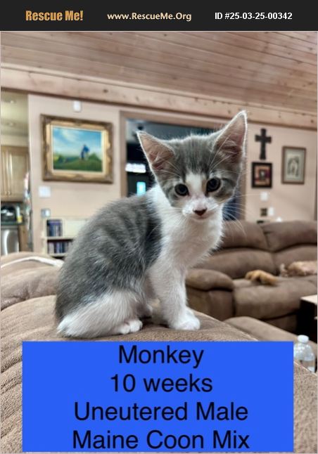 Monkey Man is an absolute bundle of joy! He is, without a doubt, one of the sweetest and most playful kittens I've ever met. His Maine Coon traits shine through-his mama and daddy are both Maine Coon/Domestic Cat mixes, and he has inherited their playful spirit and striking blue-grey eyes. He's full of energy, zipping around and playing nonstop with his siblings, just like his daddy! He would do best with a companion who has plenty of time to play with him and give him the love and attention he craves. He also has a sister available, and I'd love to see them stay together if possible-I'd be happy to offer a discount for both. They are the best of friends and love playing together! After wearing himself out, Monkey Man is happiest curling up in your lap for a well-earned nap. Maine Coons are known for their affectionate nature, high energy, and big appetites. They thrive on attention and mental stimulation (a cat wheel is a great way to keep them happy!), and around 7 to 9 months old, they often become quite talkative. If you love a cat that 'chats' with you, this breed will steal your heart. Bringing a Maine Coon into your life is truly special-once you do, you'll never want to be without one! **IF INTERESTED, TEXT OR E-MAIL WORKS BEST.** $100 EACH OR 2 FOR $170