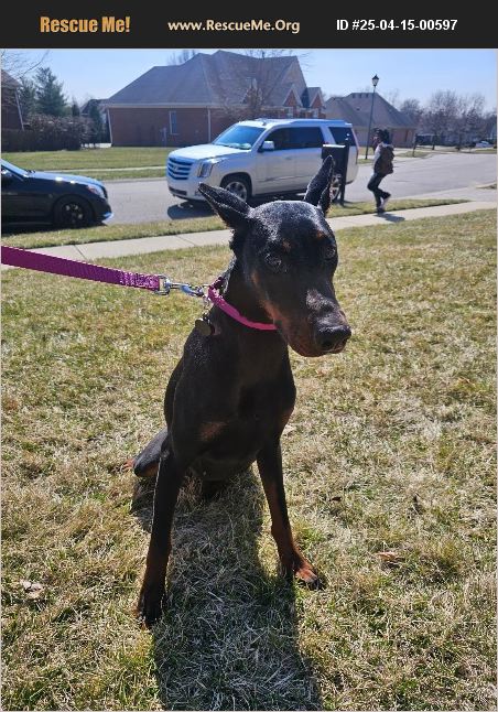 1 year old female AKC Doberman Pincher for adoption. She is very timid and shy. We think she may have been abused in the past. She loves children and does much better with them than adults. She is extremely submissive, even to small dogs and children. She needs a calm home, patience, and a lot of socialization.