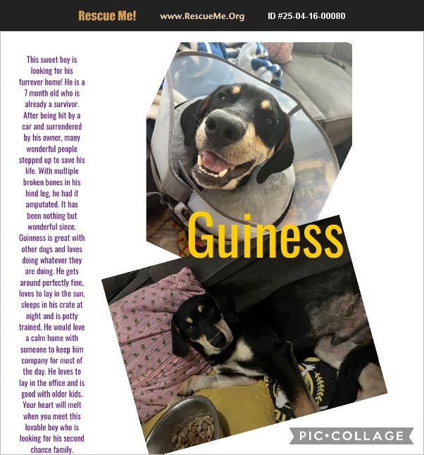 Guiness is a mixed breed (possibly shepherd/hound mix) that was hit by a car and has had a rear leg amputation. He is a 7 month old pup that loves people and dogs.
