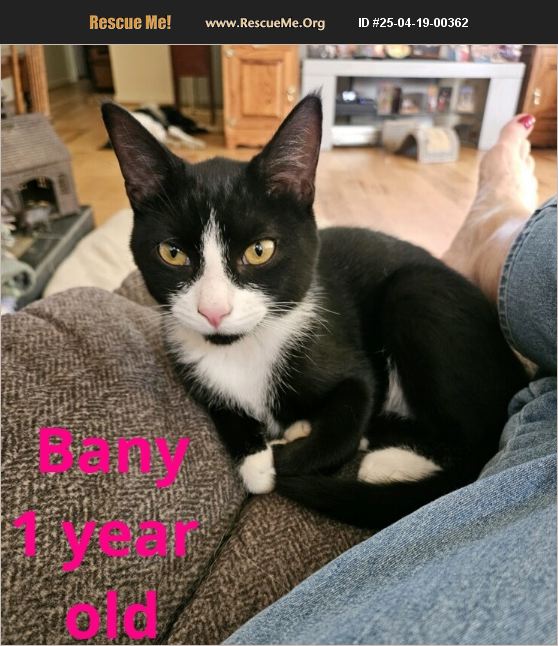 Bany is a 1 year old tuxedo girl! She is sweet and loving and very playful! Bany is good with kids, cats and dogs. She is spayed, vaccinated, FIV/ FeLV negative, microchipped and dewormed. Her adoption fee is $125.