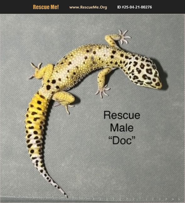 Hi I'm Doc the leopard gecko! I'm about 5 yrs old and love to explore. I can be timid at first when being picked up, but with time I will get used to you. I eat out of a bowl and will take treats off tongs. I was surrendered when my owners moved out of state. Proof of proper enclosure and supplies required. We do not ship reptiles!