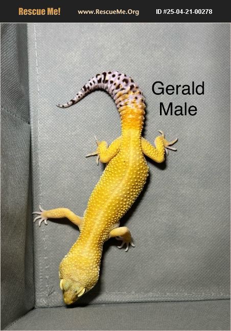 Hi my name is Gerald the leopard gecko! I am about 3 yrs old and enjoy being handled and exploring. I eat out of a bowl and tongs. I can get excited for food sometimes, so sorry if I think your finger is a worm! I was found dumped on the roadside with another gecko (Gertrude). Proof of proper enclosure and supplies required. We do not ship reptiles!