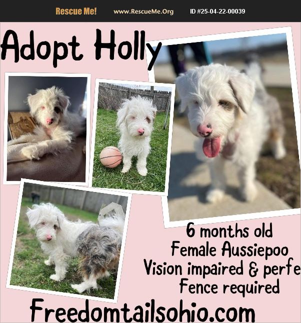 Adopt Holly! 6 months old Female, Aussie poo (Aussie/poodle mix, does shed) Fully vetted and healthy - part blind and deaf from birth Fence required but would discuss for the right adopter Holly is the most joyful pup! She is mostly blind and deaf, but she doesn't know it! Her nose helps her find her way to her food, toys, bed and/or crate, outside to sun bathe, to play whole heartedly with fur sisters or human sisters, to follow her foster mom everywhere, you get the idea! When she finds a person she loves (and really even meets a new person), her entire 15 lb body unleashes with the most charismatic tail and body wagging we've ever seen!! She is generally a calm and patient pup, but loves to play rough with other dogs! Not cat tested. She does stairs and easily jumps up on the couch and bed for snuggles. She has a great appetite and is working on potty training with a fenced backyard and doggy door. She does pretty well with potty and walks on a leash too! She will need a little extra time to find her way around and will do best in a home with lots of attention and love (although this gal will spend a good portion of her day snoozing!). She stays in her crate when her fosters are out, and she doesn't mind sleeping in a crate but does experience some separation anxiety when first crated. When lonely, she will let you know with a loud bark you can't miss. She doesn't know how loud she is! ���� Holly is incredibly playful and sweet with people of all ages, including a very busy and bossy 3 year old human foster sister. A family lucky enough to adopt Holly will be amply rewarded with her love and companionship! Apply to adopt Holly today at www.freedomtailsohio.com!