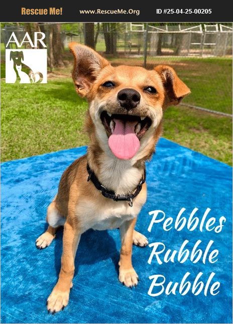 Meet Pebbles Rubble Bubble! This cheerful little sweetheart is all about fun, love, and adventure! Pebbles is full of playful energy and always ready to bring a smile to your face. Her rescuer shared that she's a wonderful companion-friendly with their dog, seems to be housetrained, and absolutely adores belly rubs. She also enjoys being picked up and showered with affection. Every day, Pebbles greets our volunteers with tail wags and happy wiggles, eager to head outside for a walk or a play session. With her joyful spirit and loving nature, Pebbles Rubble Bubble is sure to fill your home with laughter, love, and endless cuddles. Come meet her-you just might find your new best friend! Est. DOB: 11/28/24 9 lbs. AAR does not transport for adoption.