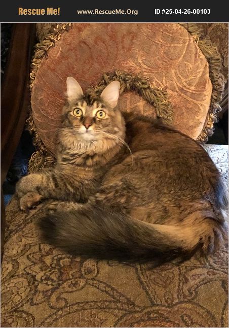 Terra is a 5 year old Maine Coon. Likes to be high. Inside cat. Beautiful color medium hair length spay front declaw. Raised from kitten. Been around small dogs and cats. Very sweet after she gets to know you. Rehome fee $100.00.