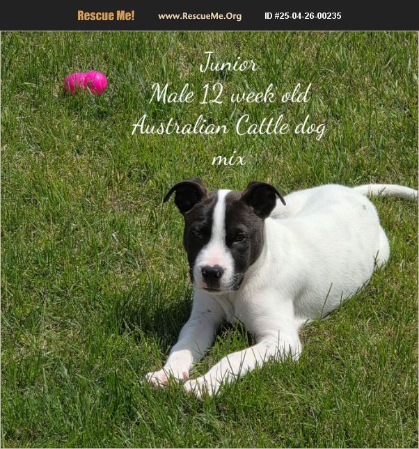 Name: Junior Gender: Male Weight: 10 lbs Age: 10 weeks at adoption Breed: unknown potential Cattle dog mix Junior is a cuddle bug. He is a sweetheart. He loves playing with brothers and soft toys. Usually has tongue out for pictures. Such a ham. Good with dogs and kids. Working on house training and crate training.