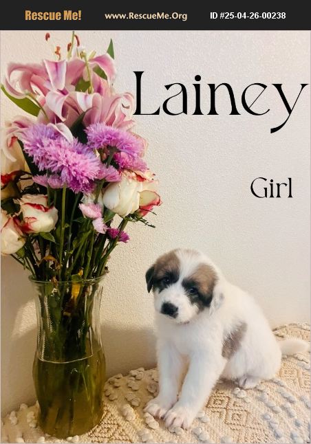 Available 5/10/25Name: Lainey Gender: Female Weight: 10-12 pounds Age: 9-10 weeks old Breed: unknown potential lab/pyr mix; Momma is a white lab Very pretty! Beautiful blue eyes. Fluffy fur. Very calm and likes to just lay around but plays with siblings. Is doing well going potty on puppy pads. Good with dogs and kids. Working on house training
