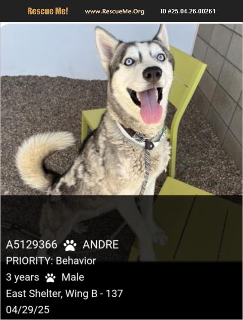 Please help me live! Mcacc Shelter has given me a deadline due to kennel stress. I have done nothing wrong so I hope you come and meet me before my deadline! LOCATED: 1920 S Lewis Dr. Mesa, AZ Fill out: https://www.thedogsavers.org/apply-to-adopt/ Call: 480-331-4188 I'm a 3yr old 32lb Neutered-male Gray/White Siberian Husky. I was adopted and returned after 24hrs because the main dog was not accepting of me. They require children 5+ as I do guard my food and dont want to hurt anyone. I am a husky so I need and want lots of play time and get my zoomies out! I love affection and cuddles! I am a fun silly, wiggly pup that loves to be brushed. I love treats and just want to run, jump and zoomie! Since I don't get out of the kennel much I'm getting stressed and they WILL take my life away! Please don't let them do this to me!!