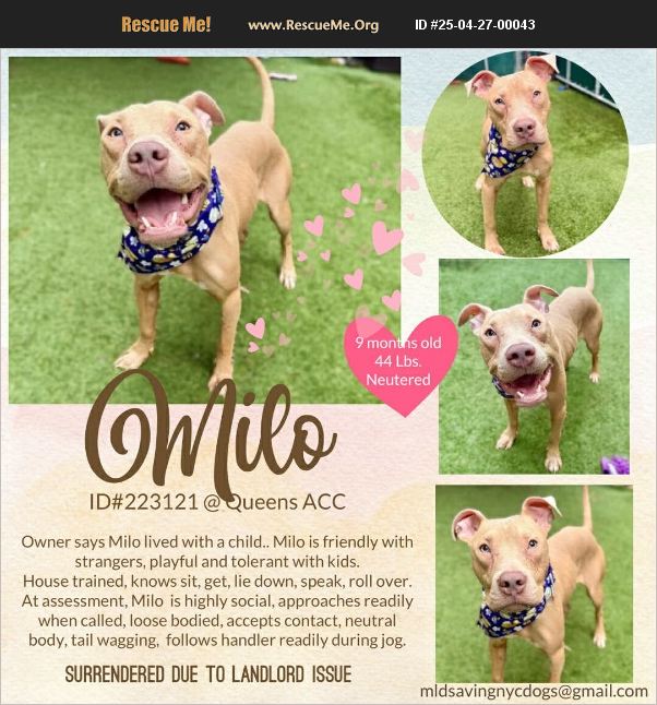 Milo is a goofy, happy lovebug with a heart full of sunshine and a tail that never stops wagging. He's the kind of dog who makes you smile just by being in the room-always eager for belly rubs, treats, and attention. With his bright, soulful eyes and joyful energy, Milo wins hearts wherever he goes. He's affectionate, playful, and so ready to love someone with everything he's got. Milo's time is running out. He's landed on the euthanasia list-not because of anything he's done, but simply because space is limited and his perfect match hasn't found him yet. It's heartbreaking to imagine a dog this full of life being overlooked. Milo is waiting patiently, still wagging his tail, still hoping. All he needs is someone to give him a chance. Open your heart, open your home-and let Milo show you the pure joy of rescue love. One yes could save his life. MILO 223121 MANHATTAN ACC Estimated to be 9 mos 3 weeks old, 44 Lbs. NEUTERED MALE, MEDIUM MIXED BREED OWNER SURR FROM NY, LANDLORD ISSUE (NYCHA) �'��MEDICAL BEHAVIOR EVALUATION: BEHAVIOR RATING: LEVEL 4 INTAKE DATE 03/29/2025