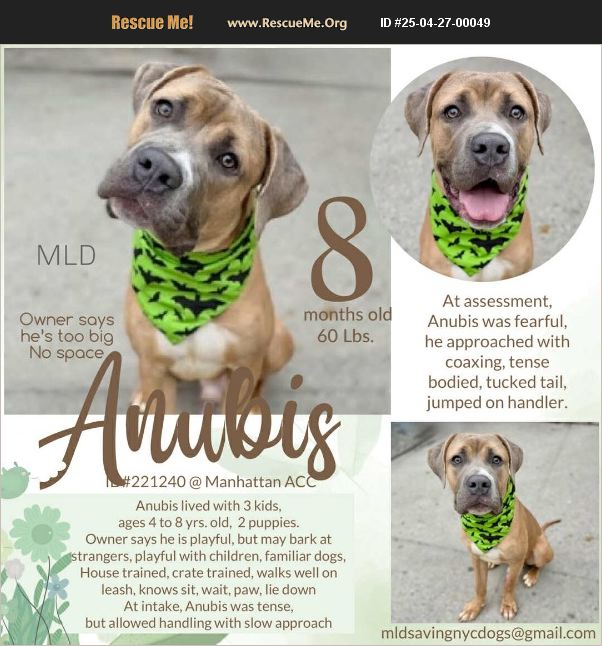 Anubis is a stunning boy with a heart full of quiet hope. Behind his noble face and soulful eyes is a gentle soul who just wants to belong. Anubis isn't demanding or loud-he's the kind of dog who waits patiently, offering silent loyalty and steady love to whoever takes the time to notice him. He's calm, observant, and deeply affectionate once he trusts you, leaning in for soft touches and cherishing every moment of kindness. Right now, Anubis is running out of time. He's been placed on the euthanasia list-not because he isn't wonderful, but because the right person simply hasn't found him yet. It's heartbreaking to think a dog with so much quiet love to give might be overlooked when he has waited so faithfully. Anubis is still holding onto hope, still waiting for that one person who will see past the kennel walls and into the beautiful heart that's been there all along. If you're looking for a loyal companion with depth, wisdom, and unwavering devotion, Anubis is ready. Please share his story, open your heart, and help him find the safe, loving home he deserves. ANUBIS 221240 MANHATTAN ACC Estimated to be 9 mos 4 weeks old, 67.5 Lbs. UNALTERED MALE, LARGE MIXED BREED OWNER SURR FROM NY, NO TIME �'��MEDICAL BEHAVIOR EVALUATION: BEHAVIOR RATING: LEVEL 3 INTAKE DATE 03/12/2025