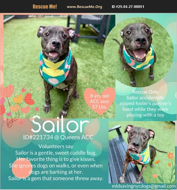 My #BoroughBreak Buddy Writes: Sailor is an absolute ANGEL! She has no behavioral issues whatsoever. All she wants to do is to be as close to you as possible. She is gentle, sweet, and loves to cuddle. Sometimes she will just stop and want to cuddle. Her favorite thing to do is to give kisses. She would look for leaves to nibble at, but she was able to be redirected. Her ideal walk is a short jog and then going to somewhere that has mulch. She is clearly potty trained and communicative. Although older pups don't get the most traction she is as home ready as it gets. We walked for a long time. We stopped to play in the grass. Then we went to a bench where she insisted on laying on top of me for as long as I would let her. We then went to Central Park where we took a rest in the grass (she fell asleep in/on my arm). We explored more in the park, worked on some training, and closed out the afternoon with a stop at the coffee shop. She was not reactive with other dogs. She would sniff them if she could, but otherwise doesn't care too much. She did not react when dogs were reactive towards her. I cannot emphasize enough how lovely she is and I hope her forever parents see what I see in her. SAILOR@MANHATTAN ACC Sailor ID#221734, 8 years old, 53 lbs Medium Mixed Breed, Br Brindle Unaltered Female Came into shelter as a Agency ��%BD'��%BD��%BDMedical Behavior Evaluation: Behavior Evaluation Rating: NHO INTAKE DATE: 3/4/2025