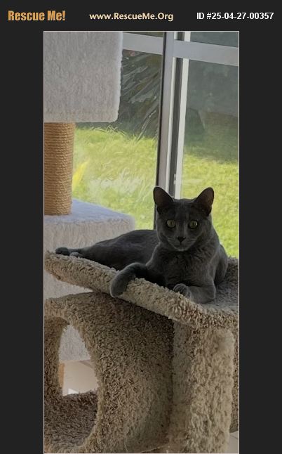 Very sweet, healthy one year old Russian Blue, or possible mix. Very playful, loving, partially socialized. Very smart, wants to be petted, uses kitty litter, easy with feeding habits, Likes both wet and dry food.