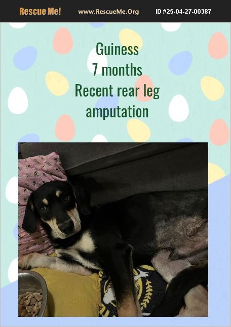 Guiness is a beautiful pup. He is approximately 8 mos. We do not know his breed mix, but suspect he is shepherd/hound/husky. He suffered a badly broken leg when he was hit by a car and had to have a rear leg amputation. He does well with other dogs and kids (cats unknown).