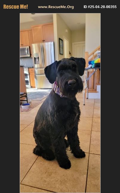 She is a very sweet and loving AKC registered giant schnauzer. High energy so needs lots of space. Has been raised with miniature schnauzers, so she thinks she's small and doesn't know her strength. Has had obedience training so knows a lot of commands and is crate trained. Should be in a home with no dogs or a large dog, has not been around kids, so not sure of her temperament with kids.