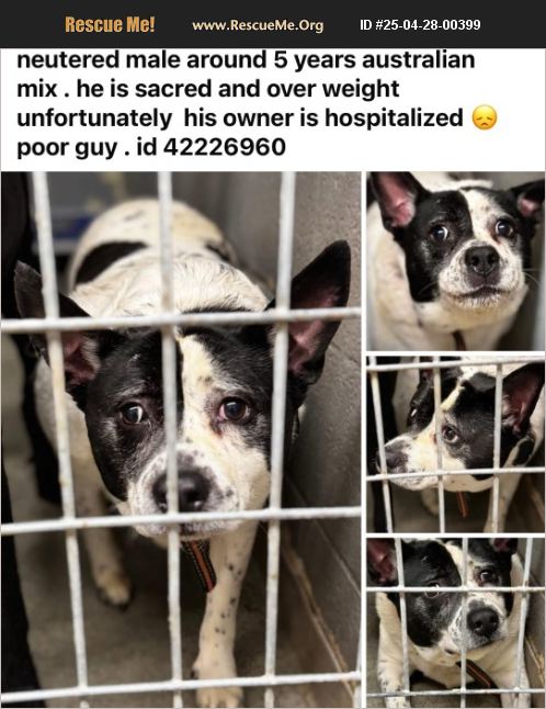 this sweet guy a little scared in the kennel. outside he seems good. he is 5 years old and came in rocco. him family had to give up due owner health. he needs a love and care and a loving home and exercise