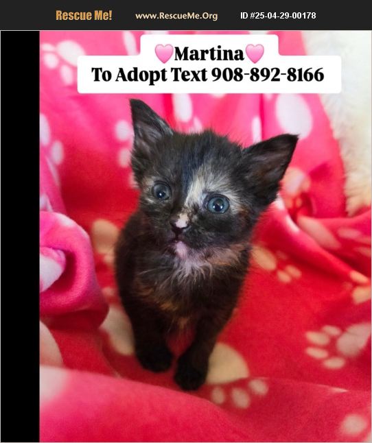 URGENT! SAVE MARTINA!! This beautiful orphan homeless rescue kitten is from an over-crowded high-kill shelter and urgently needs an Adopter to Save Her! MARTINA is so beautiful with her tortoiseshell colored coat; she purrs when held and is so smart, loving, and playful! To Adopt please Text Message 908-892-8166 *MARTINA is SIBLINGS with her sisters: ELIZABETH and MARGARET, and her brothers: HERMAN, HORTON and ALEXANDER! These kittens can be adopted Separately or Together!*