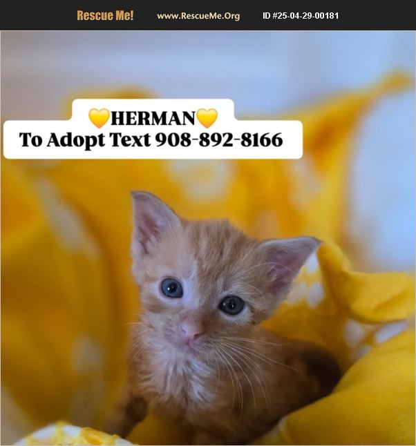 URGENT! SAVE HERMAN!! This precious little homeless rescue kitten is an orphan from an over-crowded high-kill shelter and urgently needs an Adopter to Save Him! HERMAN is outgoing, playful, smart, and loving! To Adopt please Text Message 908-892-8166. ***HERMAN is SIBLINGS with ELIZABETH, MARTINA, MARGARET, HORTON and ALEXANDER! These kittens can be adopted Separately or Together!*