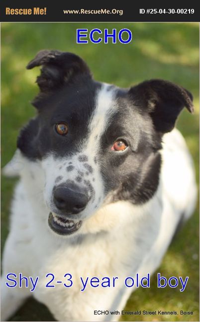 ***NEEDS FOSTER or FOREVER HOME*** Currently in Boise boarding kennels Meet ECHO! ECHO appears to be a border collie/cattle dog ~1 year old, 47 lbs. He was found abandoned in the desert. It was obvious that he had been through some physical trauma (possible animal attack) as he still has some physical scars. He still displays some unsureness of his surroundings, but with the love and care of the kennel staff and volunteers, he shows his softer, sweWe are still getting to know ECHO, but he is calm, quiet and walks well on leash. He did well in a home with another dog during neuter surgery recovery. He is crate-trained and sleeps through the night. ECHO was frightened by screaming kids on the playground, so a quiet, calm home is best for him at this time. MORE PHOTOS/VIDEOS: https://photos.app.goo.gl/jFe49vfFsXVHon5K6 ECHO's adoption will include health vaccines, rabies vaccine, and neuter surgery. Complete an easy, online adoption application to meet ECHO in Boise APPLICATION: https://forms.gle/U3UUbdpNzZVpxP9h8