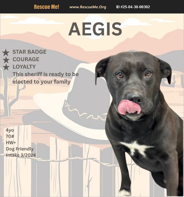 Aegis could be the sheriff of your compound with his permanent star badge of honor. Instead, he sits in a kennel 24/7 with nowhere to roam, horses to corral, cow-poke to protect. His casts a stocky shadow sure to keep you warm on a cold prairie night. Please contact us to foster/adopt/SAVE AEGIS