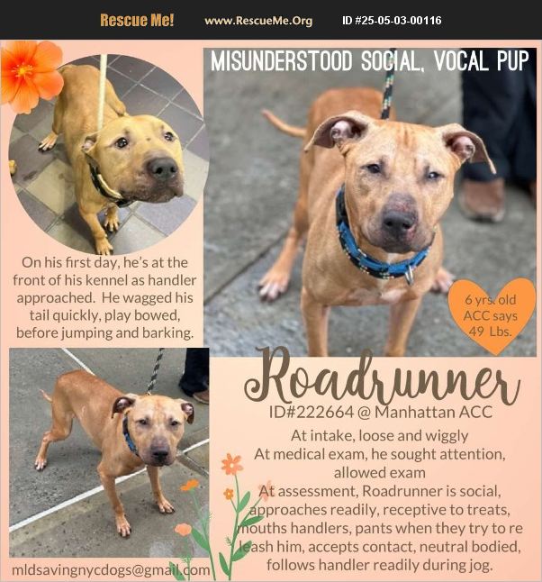 ROADRUNNER 222664 MANHATTAN ACC Estimated to be 6 years 6 mos 2 weeks old, 49.5 Lbs. UNALTERED MALE, MEDIUM MIXED BREED STRAY FROM NY �'��MEDICAL BEHAVIOR EVALUATION: BEHAVIOR RATING: NH ONLY INTAKE DATE 03/19/2025