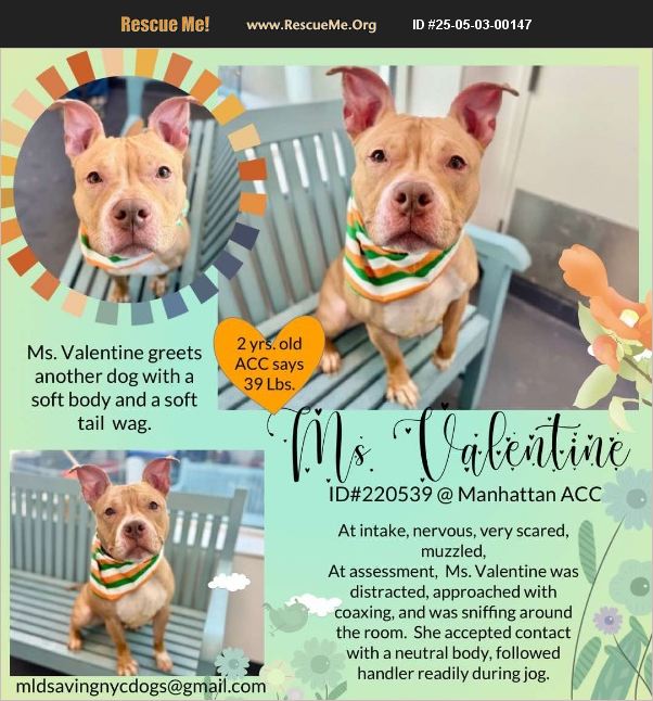 MS. VALENTINE 220539 MANHATTAN ACC Estimated to be 2 years 2 mos 1 week old, 45.5 Lbs. SPAYED FEMALE, MEDIUM MIXED BREED STRAY FROM NY 10456 (found on Teller Ave.) �'��MEDICAL BEHAVIOR EVALUATION: 3 YELLOW BEHAVIOR RATING: LEVEL 4 INTAKE DATE 02/14/2025