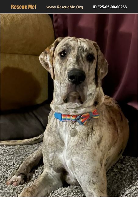 Howdy is a 2.5 year old (DOB9/30/22) neutered male great dane. We are looking for an experienced giant breed owner that can provide the structure and training he needs to become a confident and well behaved dog. Details: Neutered brindle/merle 130 lbs. He is an indoor dog. He is house/crate trained. Heart Worm Negative and current on monthly prevention. Up to date on all vetting/vaccinations. Leash trained with gentle leader and easy to manage when there is no outside stimuli present. He uses a basket muzzle on walks due to reactivity to seeing other dogs. Personality: Cuddly and sweet and can be very mellow and loveable. Food motivated and not know to resource guard. Currently walked 25 minutes daily. He would love more! Loves to play and gets spurts of zoomies. Will chase and catch anything in his yard (squirrels, birds, bunnies, possum). He lives with 2 other dogs, but has a lack of social skills and does not currently meet other dogs due to reactivity. We had the opportunity to test him with some unknown dogs, wearing a muzzle and he did well. He challenges our other Great Dane, neutered male 6 years, when he attempts to correct him. He does not challenge our 18 pound spayed female mix breed when she corrects him. We believe he could do well living with a buddy, with proper introduction by experienced handlers. It is very important that anyone interested in him understands his unique needs and has the experience and resources to be successful. We will screen potential adopters accordingly. Appropriate rehoming fee will apply.